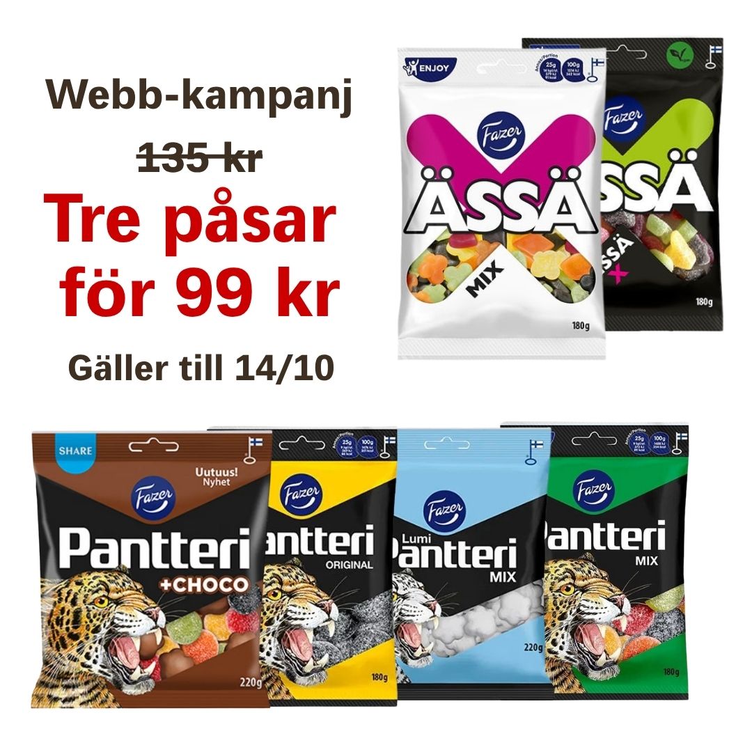 Pantteri och Ässä är klassiker från Fazer – älskade för sina friska smaker och sega konsistens. Just nu får du tre påsar för 99 kr (ord. 135 kr).