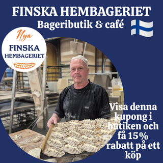 Visa kupongen i vår bageributik och få 15% rabatt på ett köp. Kom förbi och njut av nybakat bröd, finska specialiteter, kaffe och glass!